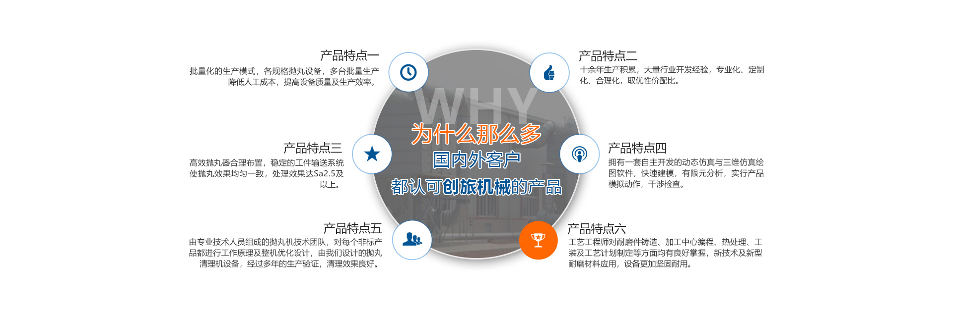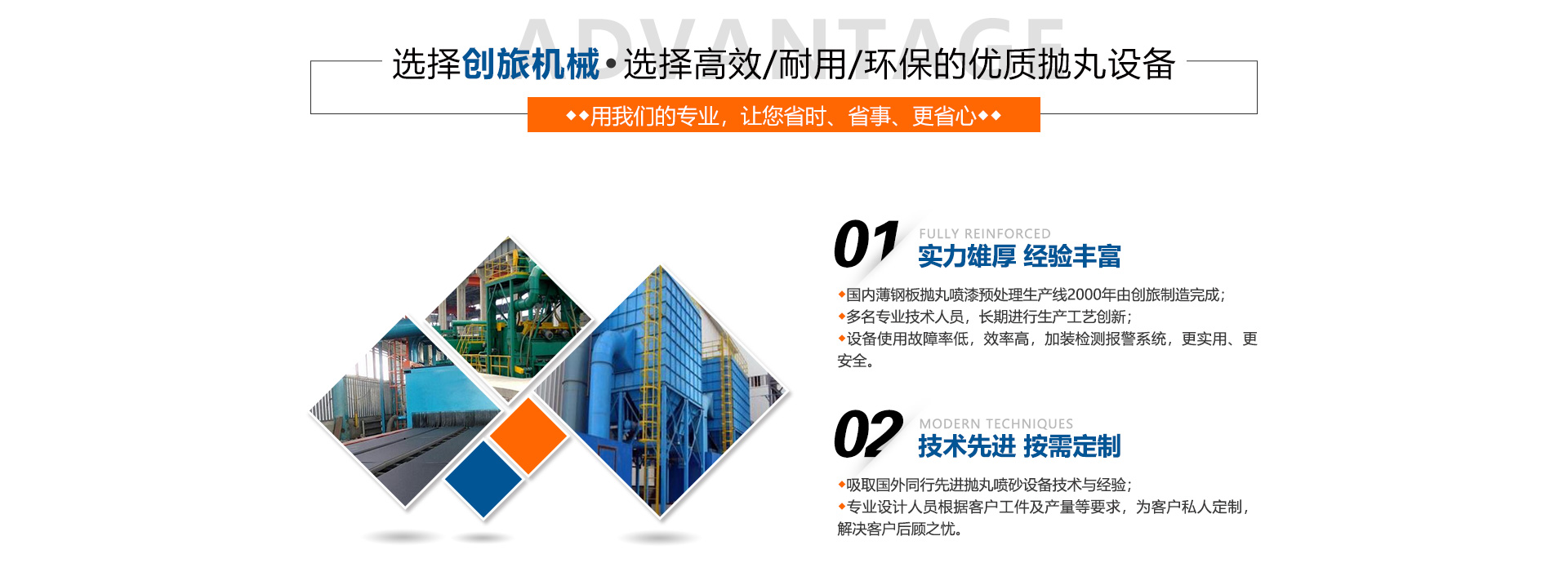 合肥市創(chuàng)旅機械有限公司是專業(yè)的噴砂房、拋丸機生產(chǎn)廠家,生產(chǎn)不同型號不同價格的江蘇拋丸機、江蘇 噴砂房、除銹機、拋丸清理機械、自動噴砂機械、通風(fēng)除塵設(shè)備、砂處理成套設(shè)備、鋼丸及各種耐磨合金 件的大型專業(yè)化制造企業(yè)。 我公司愿與各行各業(yè)的朋友交往與合作,使您的產(chǎn)品更光彩! 產(chǎn)品有:鋼板預(yù)處理生產(chǎn)線,噴砂房,噴砂機械,噴砂設(shè)備,拋丸機,拋丸清理機,混砂機,噴丸機 ,拋 噴丸機,履帶式拋丸清理機,鋼板除銹機,鋼材除銹機,板...
